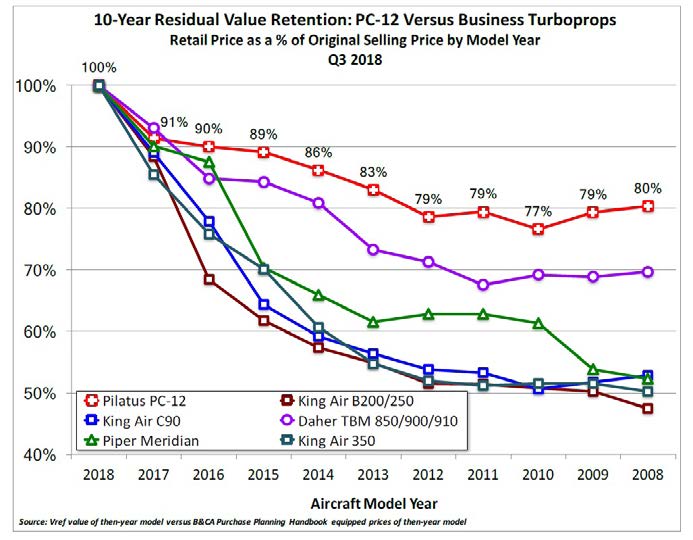 The relatively few PC-12 aircraft that are sold in pre-owned markets are currently retaining about 80% of their original selling prices 10 years after factory delivery, a performance that continues to be unmatched in the business aircraft industry. This is a testament to smart design, careful factory pricing and production and a managed product life cycle process.
